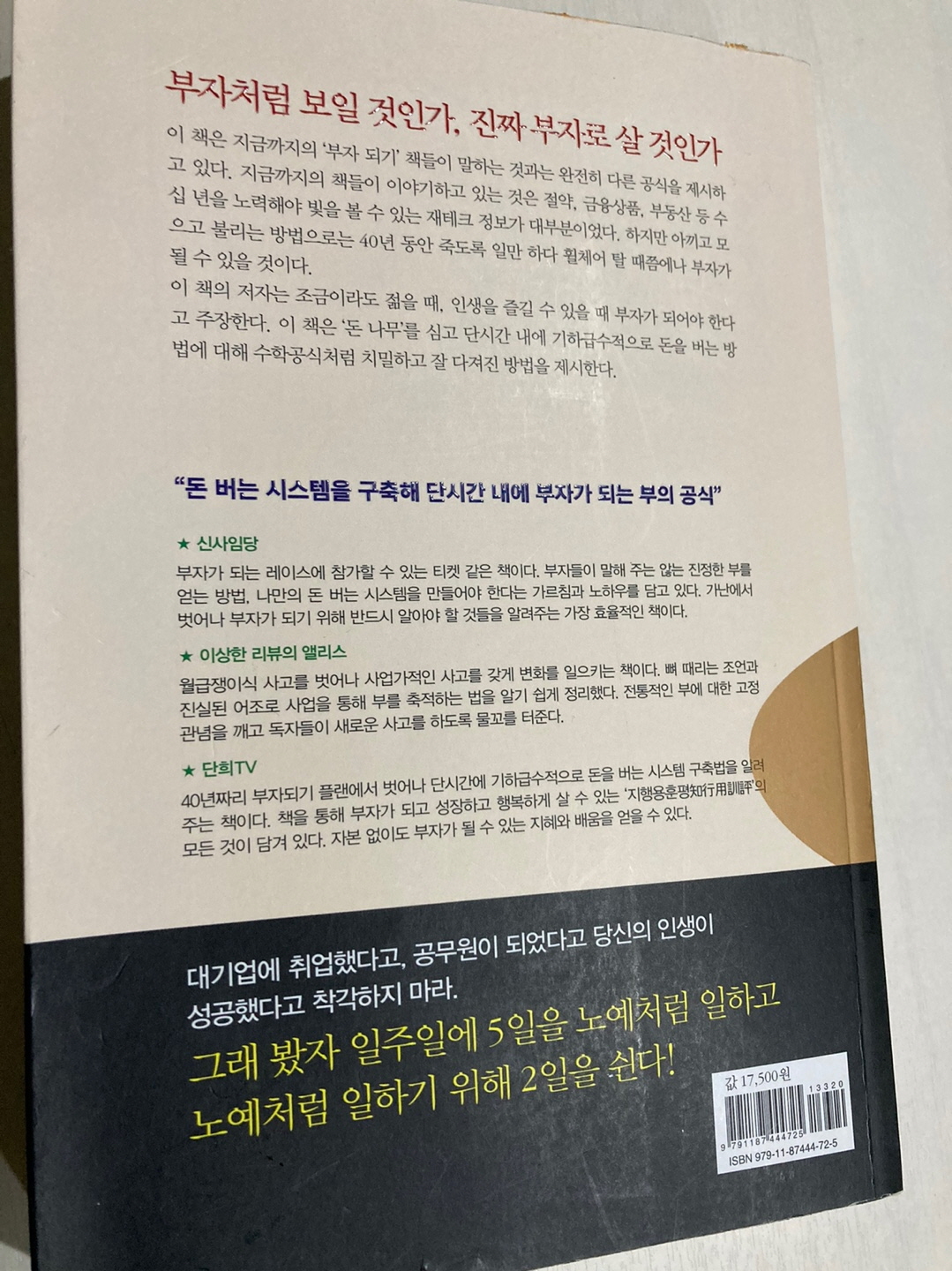 저 또한 직장인이지만 이 책을 읽고서 빠르게 부자 되는 방법을 보고 참 많은 방법이 있다는 생각을 했고, 그렇게 될 수 있을 것 같다는 생각이 들었습니다. 그래서 지금도 아이템을 찾고 있는 중입니다.